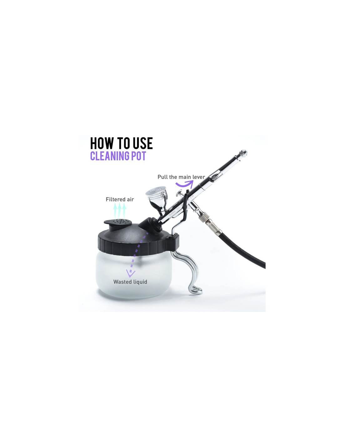 El kit destaca por su funcionalidad y precisión. El tarro de limpieza de vidrio resistente actúa como soporte estable y permite purgar el aerógrafo de forma segura. Para un mantenimiento exhaustivo, la aguja de limpieza es de alta precisión y su diseño especializado permite limpiar sin esfuerzo los pigmentos obstruidos dentro de la boquilla, solucionando los atascos más persistentes. Además, cuenta con un juego completo de cepillos de limpieza de diversos tamaños para asegurar que cada conducto interno quede libre de residuos.