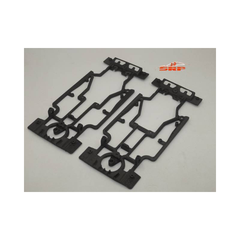 Chassis fabricado con un Nuevo polímero Bicomponente, impreso en 3D con sistema FDM . Se caracteriza por su gran resistencia, flexibilidad y ligereza. El chassis HYRSS, nos permite elegir la flexibilidad del chassis, cortando la unión entre los dos tetones del soporte del motor.(Ejem. en la foto).