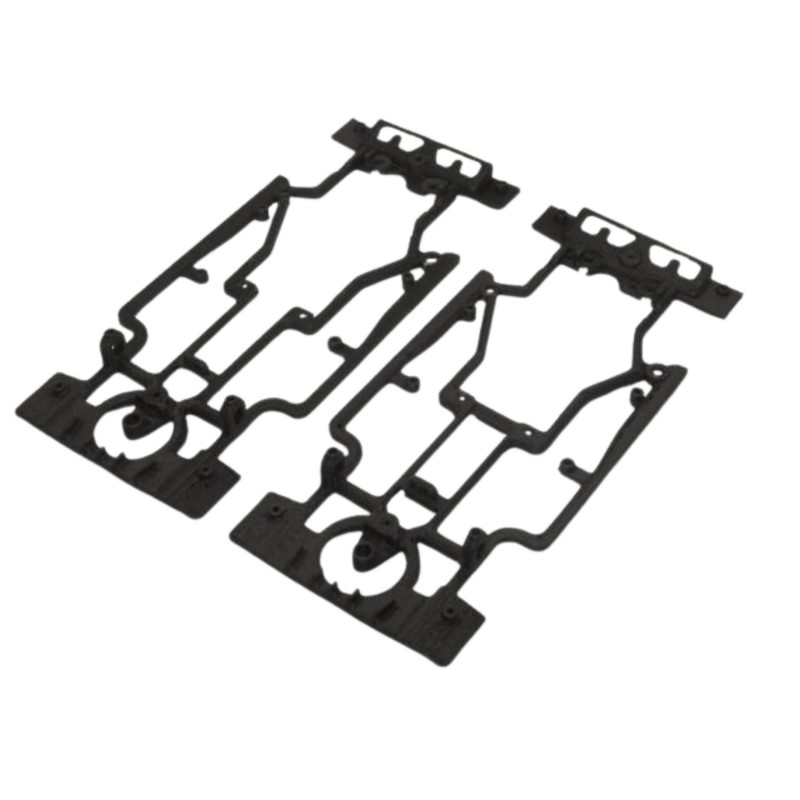 Chasis fabricado con un Nuevo polímero Bicomponente, impreso en 3D con sistema FDM . Se caracteriza por su gran resistencia, flexibilidad y ligereza. El chasis HYRSS, nos permite elegir la flexibilidad del chasis, cortando la unión entre los dos tetones del soporte del motor.(Ejemplo en la foto).