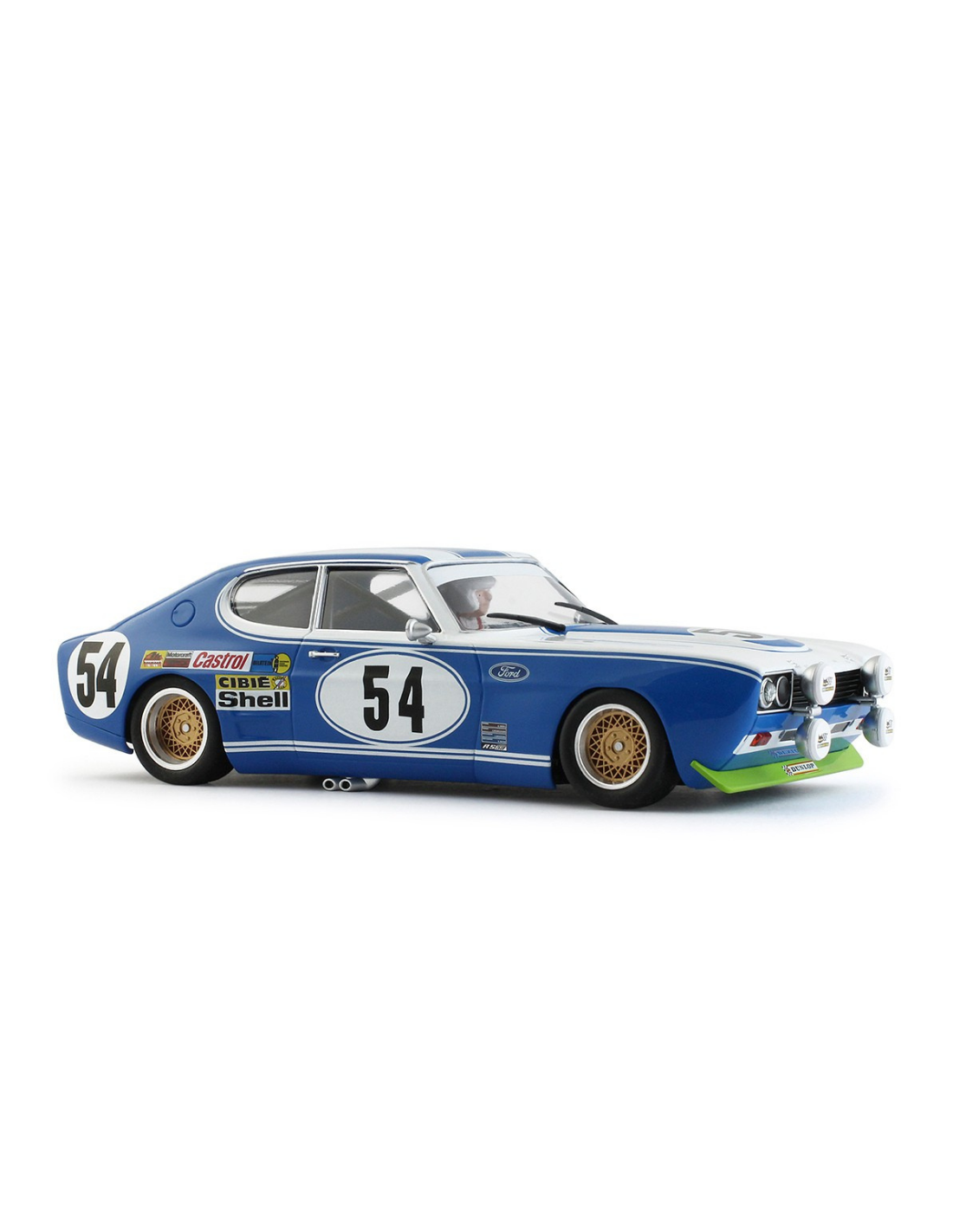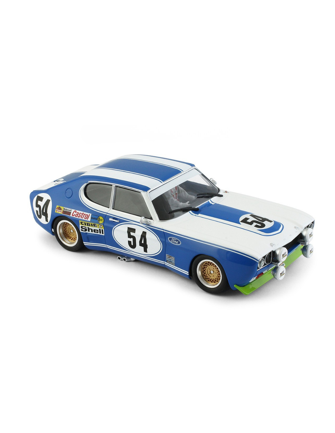 El Capri RS2600 fue la respuesta de Ford a la competición, ofreciendo una máquina ligera y potente. Esta réplica a escala $1/24$ luce una de las decoraciones más clásicas y atractivas: la combinación de azul Ford y blanco, con el patrocinio icónico de Shell, Castrol y Cibié. El dorsal #54 y sus múltiples faros auxiliares le dan un aspecto inconfundible de coche de resistencia.