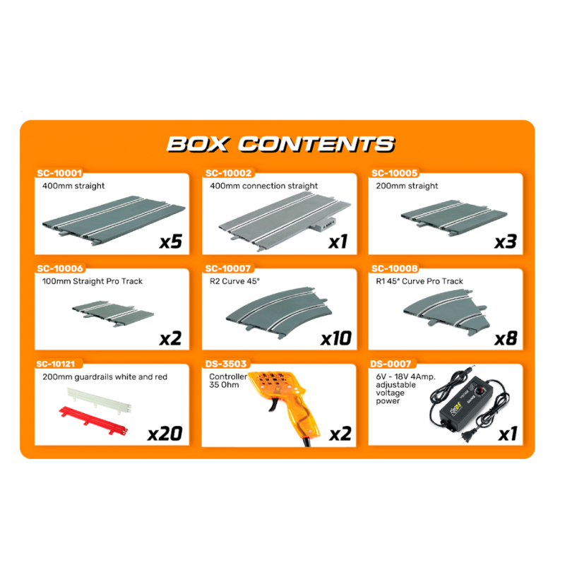 Este set completo Scaleauto Pro Track SET-001 incluye todos los elementos necesarios para empezar a correr con calidad profesional: