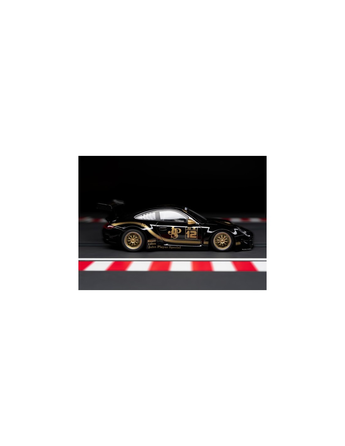 Este modelo rinde homenaje a la mítica decoración en negro y oro popularizada por el equipo Lotus de Fórmula 1, dándole un aspecto espectacular y elegante a la carrocería del poderoso Porsche 997. El coche n.º 12, con su llamativa estética, es una pieza que robará todas las miradas tanto en tu vitrina como en la pista.