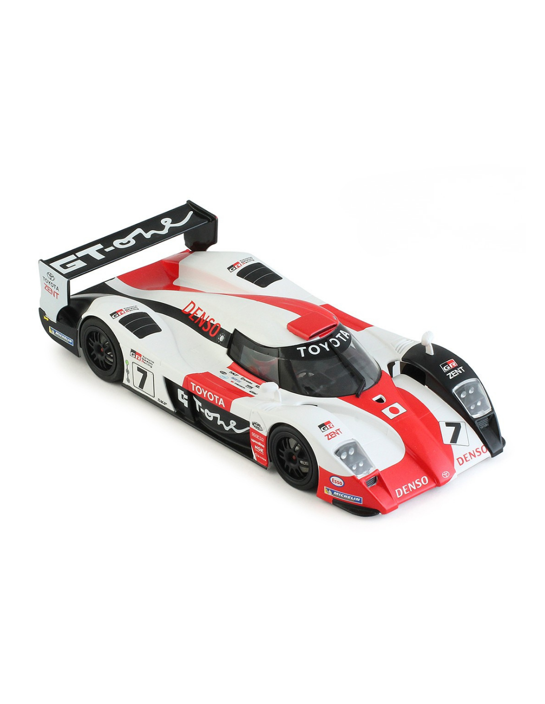 El GT-One fue el gran aspirante a la victoria de Toyota, dominando gran parte de la carrera de 1999 hasta que un fallo en la transmisión a solo 90 minutos del final le privó de la gloria. Esta maqueta captura fielmente el diseño futurista del coche real y su mítica decoración Denso en los icónicos colores rojo y blanco.